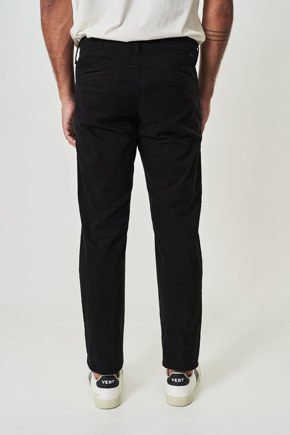 A Calça New Chino é confeccionada em sarja levemente estruturada com elastano. A peça possui cintura média, bolsos faca na frente, bolsos embutidos atrás e fechamento frontal por zíper e botão.